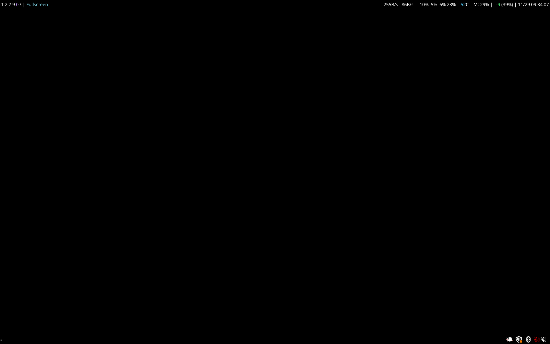 my workflow revolves around workspaces. each one holds a single fullscreen window. generally, i’ll have somewhere between ten and twenty workspaces. i’ll occassionally use a vertical split and show two windows at once.