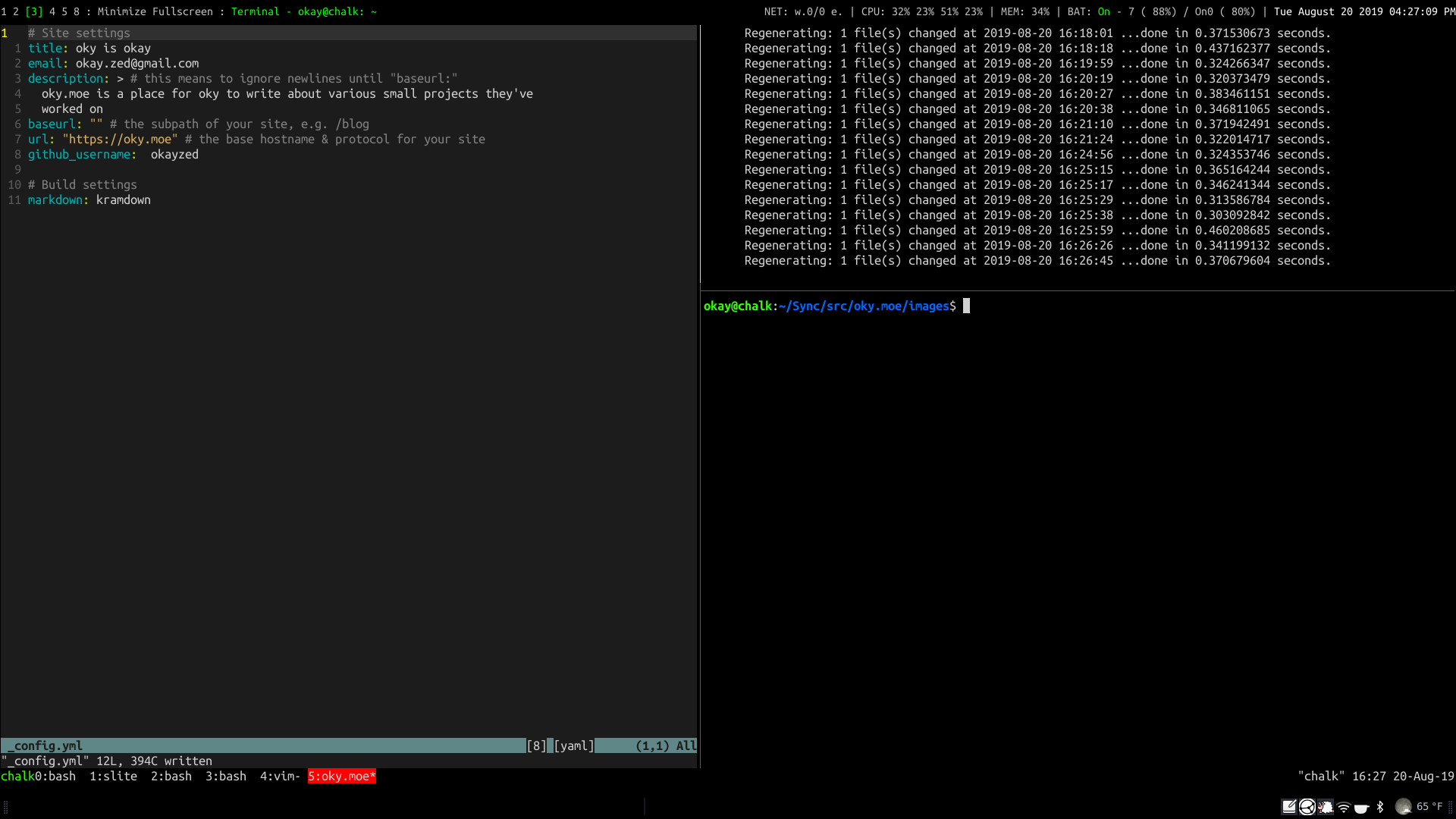 What I like about xmonad is that I can do most of my window management tasks using the keyboard and dual monitors are well supported. There’s a simple timelessness to a minimal desktop: my rot window is all black and there’s no window decorations for minimizing, maximizing or closing windows.